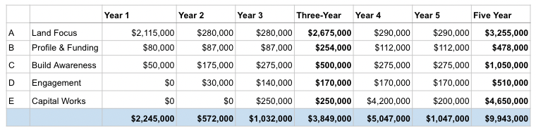 We estimate getting into the third and final phase will take approximately five years and $10M. Large parts of the $10M budget are dedicated to land focus and capital works. The third phase will mark a transition to economic sustainability - a goal of generating sufficient revenue from the land and its activities to cover operating and costs.